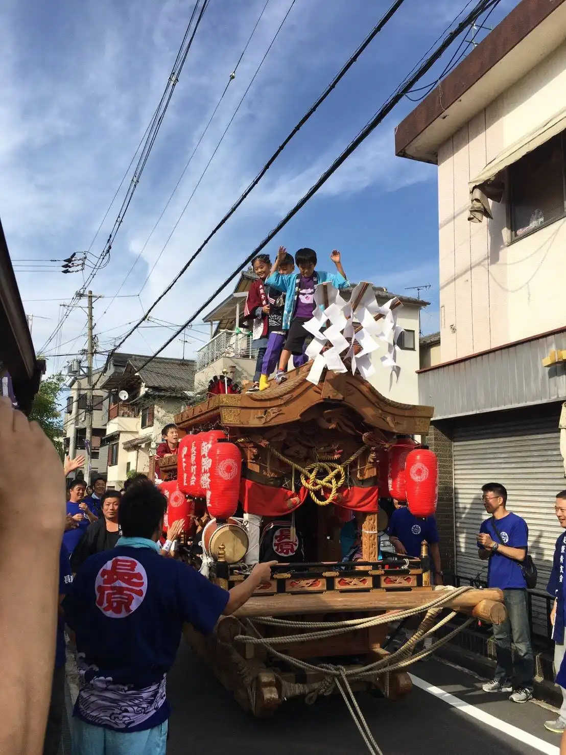 長原のだんじりは子供だんじりです小学生低学年の子供たちが大太鼓・小太鼓・鐘をたたきながら3台で町内を曳航します綱はどなた様にも引いてもらえます。家族連れでお気軽にご参加ください